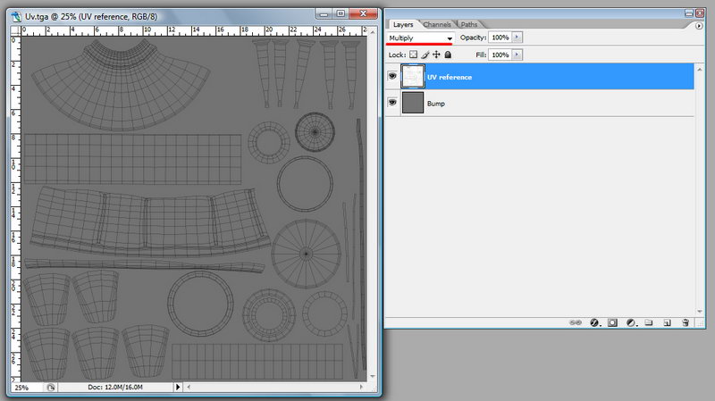 While “UV Reference” layer is selected change it’s style from “Normal” to “Multiply”, so you can see the layers underneath. Make a new layer under the “UV Reference” and call it “Bump”.