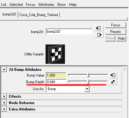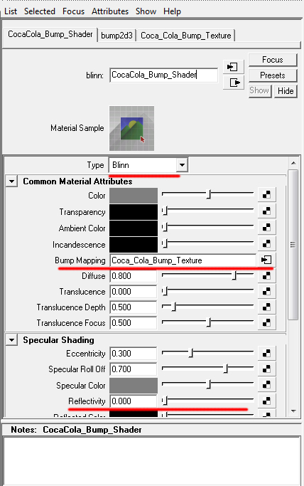 Simply make a blinn shader and apply our texture (“CocaCola_Bump.tga”) to its Bump mapping section. Try to reduce the “Bump depth” to something around 0.040. Also, make sure reflection is set to zero.