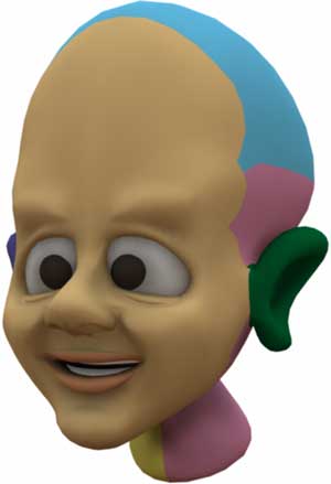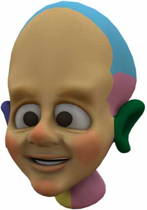 Trying a new approach to the texturing. I have divided the head into different texture areas. Each color shows the different areas, and each area has a sperate image file mapped on to it. beige, blue, pink, yellow: Planar mapped I am painting the maps in photoshop. |