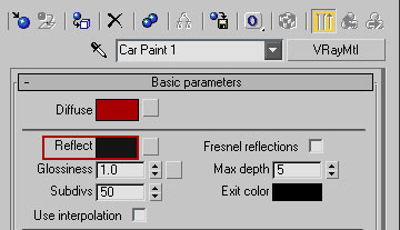 Now after you select “VRayMtl” go back into the material editor and rename the material “Car Paint 1” and change the diffuse and reflect color. I gave mine a nice red but any color should do. Change your reflection color from 100% black to RGB: 20-20-20: