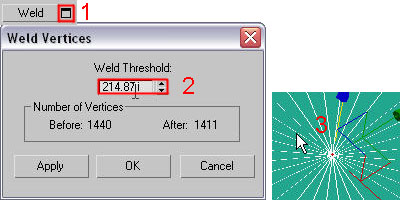 9) Now locate the Weld button on the right. Click on the little button to the right of it. A window will pop up. Put the Weld Threshold up until you see that all of the vertices are joined into just one vertex. You are done with it.