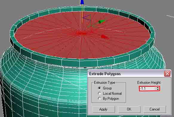 14) While those polygons are still selected, click on extrude, and extrude the polygons down until there is a nice pit.