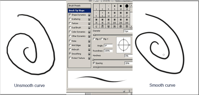 Well lets first open up Photoshop, then say create new file and fix up the resolution you want like 800 pixels X 600 pixels and then set the dpi, 72 is lowest, ok so we start off with a new file then open up the reference image in Photoshop, the very important thing before we start painting a image is look at the reference with half closed eyes, why? Because it gives you the good idea about highlights shadows and mid tones and so it will be easier for you to judge and paint it. now take a brush of size 2 or 3 pixels and then add a new layer now lets start painting the outline , this drawing has to be very similar to the reference and detailed so that it gives u idea bout highlights mid tones and shades, well while drawing many of you might face this problem about unsmooth curves in Photoshop, so you don’t need to worry open up the brushes option box and just check that smoothing option is ticked one more problem related to brush when you take a big brush and try to paint you will find your lines kind of dotted , so go to brush options and then tip shapes and turn that spacing from 25 to 1, now try drawing hey!!! it works right. So few more helpful tips for brush b is the hot key for brushes in Photoshop and if u want a hard brush to have smooth edges just press n hold shift and [ this will make the brush smooth and exact opposite for hard edges like i have explained earlier.
