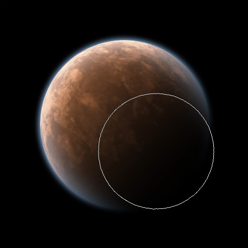 Start with a plain black image, 500×500 pixels. Make a new layer and, using the circle marquee select a circle about 2/3 the size of the root image. Fill it black, and leave the marquee active (do not deselect). Grab the Airbrush Soft Round 300 (we need a big, fuzzy brush). Set the opacity of the brush to 30% and the mode to Linear We’re going to pretend our light source is coming from the upper left (this is arbitrary). Start brushing color (we’ll use hexadecimal value 664029) from about 8 o’clock to 2 o’clock, working towards the upper left corner. You want the result to look like the image to the left of this text. Basically, we’ve just established the main “sphere” of our planet. |