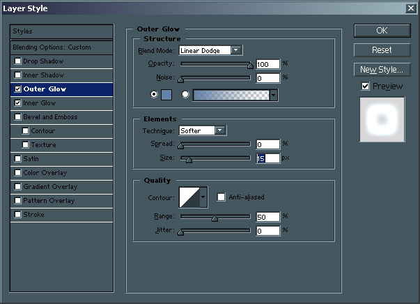 Add an outer glow as shown… for the purposes of this tutorial, we’ll use hexadecimal color value of 6283A7 for the glow color.