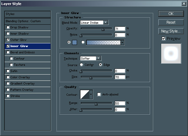 Add an inner glow as shown… again, we’ll use hexadecimal color value of 6283A7 for the glow color, because the two glows need to match, or they’ll look really silly where they meet at the planet outline.