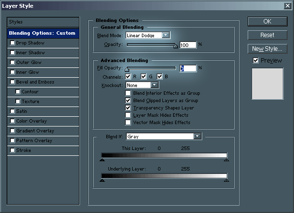 Change the Blend Mode to Linear Dodge, and the Fill Opacity to 0% (as shown)