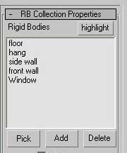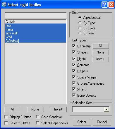 11-ok now the rigid body modifier appears from there just chose “Add” the add window will appear select every thing in the scene except curtain because we are going to add reactor cloth to our curtain then it will create error in the simulation if its already in rigid body collection. as image below.