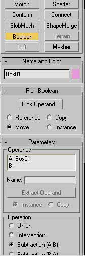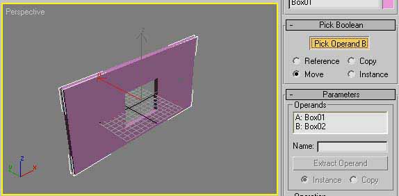 5-from compound objects now chose “Boolean” and then tall small window appears from the window chose “Pick Operand B” and then click on small box to which we want to create hole for our window, as image shown below.