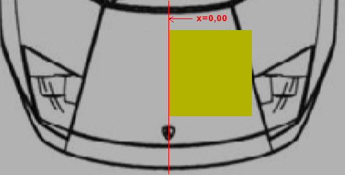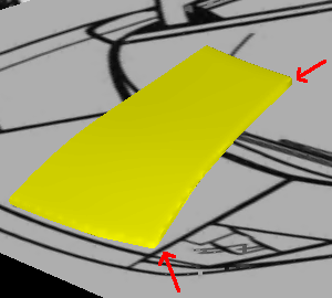 Draw the rectangle and position it right off centre on the hood, when seen from the top (see next screenshot). While drawing the rectangle you will see that the appearing object seems to be smaller then what you actually draw. Don’t worry about that, it will be corrected later on. While drawing the rectangle, you might find it appears under the textured rectangle. If this happens, simply move the textured rectangle down a bit, or move the SDS rectangle up until it appears. When done, rename the rectangle (called subdiv2 or so) to ‘Hood’.