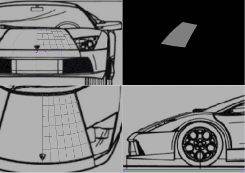 This next step is optional. Many people like to use the Quadview environment when modeling cars. If you do not have this as default working environment, you can select it using the Environments -> Quadview menu option. This divides the modeling part of your screen in four parts. Each part can use its own view on your project (front, side, top and perspective). You can use the camera icons on the right-hand side of the screen to change the views for each window. You can switch between wire frame and OGL display independently for each window. You can even render each window separately if you like. If you wish to enlarge a particular view, simply double click it. To return to normal size, double click it again. Make sure you use parallel projection for the front, side and top view (you see no ground plane in the view window). Also hide the grid and disable snap-to-grid.