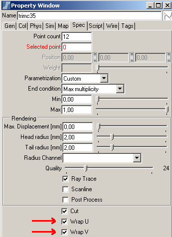 Enter these values as shown above in the material Property window and then close it; the material is ready. The grille is not a very large object and you need small holes. Select a grille object and apply the Grillestexture as a parallel mapping and make the texture object square shaped. Use small dimensions: the larger the texture object, the bigger the holes! The last step is to set the color of the grille object to a very dark grey (0,16 0,16 0,16) via the Properties -> Col tab.