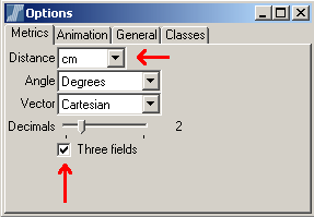 Start Realsoft3D. The first thing to do is to set the metrics for the modeling environment to proper values. Select the File -> Preferences menu. The Options window shows. Click the Metrics tab and set ‘Distance‘ to cm (centimeters) and make sure the ‘Three fields‘ option is checked.