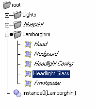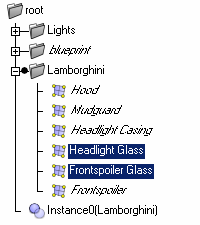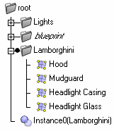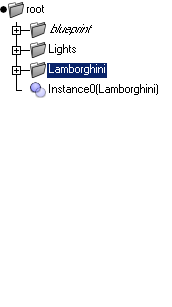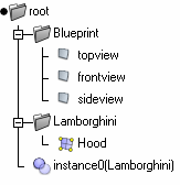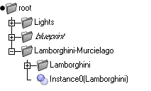 As said before in the beginning of this tutorial, we will make use of instances to model the other half of the car. To let an instance create the other half of the Hood, we need to make some adjustments in the hierarchy first. Create a new level (press Shift + L key) and rename the new level to ‘Lamborghini‘. Drag and drop the Hood object in the Lamborghini level. To create the instance of the Lamborghini level, press and hold the Alt key, and then drag and drop the Lamborghini level on the Root. This creates a new object in the hierarchy, called: instance0(Lamborghini). Your hierarchy now looks like this: