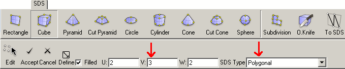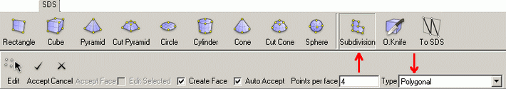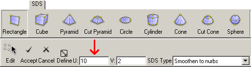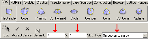 Make sure you are in OGL (shaded) display. Take a top view, and zoom in so you can clearly see the outlines of the car. Create an SDS rectangle, use 4 vertices in the U direction and 4 vertices in the V direction and use the ‘Smoothen to nurbs‘ type, like shown in the next screenshot: