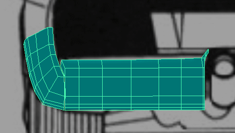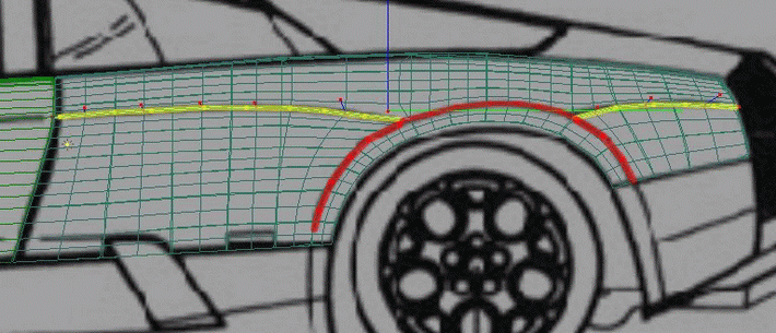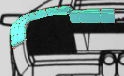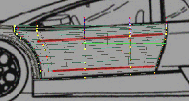 After the first extrude, you can delete the original vertical faces from this object, they are no longer needed.Now with this simple technique its just a matter of adding faces and moving points around, and thus keep the shape matching the blueprint pictures. Sometimes check your progress with a test render. While modeling, keep an eye on the important contours of the car model. Note (see next image) how the mesh and the red lines match the headlight area and this grey line along the side of the nose. This is important, because later on we need to work on these areas.