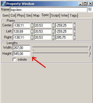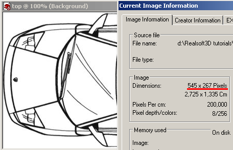Select the ‘topview‘ rectangle and open the properties (press ‘p’ key). In the Property window, click the Spec tab. We will model the car in a scale of 1:1. To get to a proper 1:1 scale, we must use the dimensions of the blueprints we use (and not the dimensions the car has in reality). So, use your favorite paint program or file manager and check the dimensions (length and width) of the blueprint images you use. In our case: 545 by 267 pixels. See next screenshot: