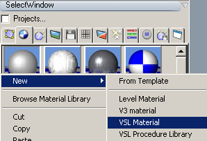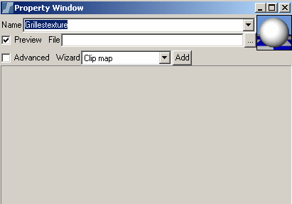 Let’s see how this works. At the materials tab of the Select window, right click and select New -> VSL Material. Rename the new material to ‘Grillestexture‘. Open the Property window for the Grillestexture material. Enable the material preview, so you can see the effect of your modifications. Use the Wizard to add a Clipmap. Then in the FileName field select the Grillestexture.bmp file.