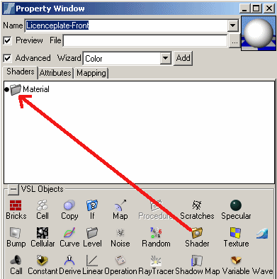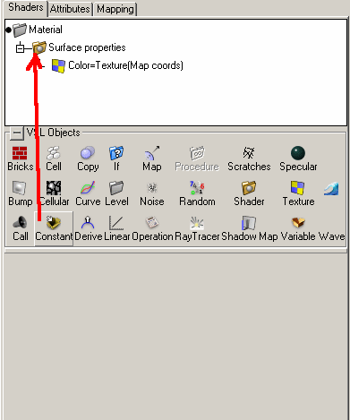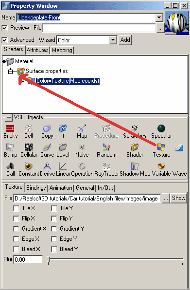 Drag and drop a Shader object onto the Material icon. This adds a new object, called Surface Properties, to the VSL hierarchy. Then add a Texture object. Just drag and drop it on the Surface Properties object. In the lower part of the VSL Property Window (texture tab), you can select your texture file. Note that when you select the file, the preview sphere of the material is updated immediately.