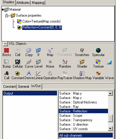 Next, drag and drop a Constant object on the Surface Properties object. A new object is added, called ‘Color=Constant(0,0,0)’. Also note that the preview sphere at the top turns black. Then at the bottom of the window, you can change properties for the Constant object. Click the In/Out tab and select ‘Surface: Reflection‘ from the list. Note that the name of this object in the VSL hierarchy changes to ‘Reflection=Constant(0,0,0)‘