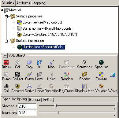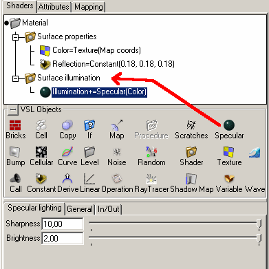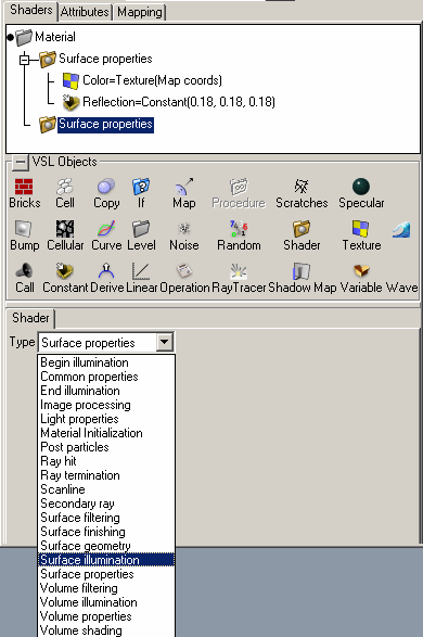 Now add a new Shader to the VSL hierarchy. Just drag and drop it on the Material icon. Change the Shader Type to ‘Surface Illumination‘. Note that the name of the new object changes from Surface Properties, to Surface illumination. To finish the VSL material, drag and drop a Specular object on the Surface illumination object.