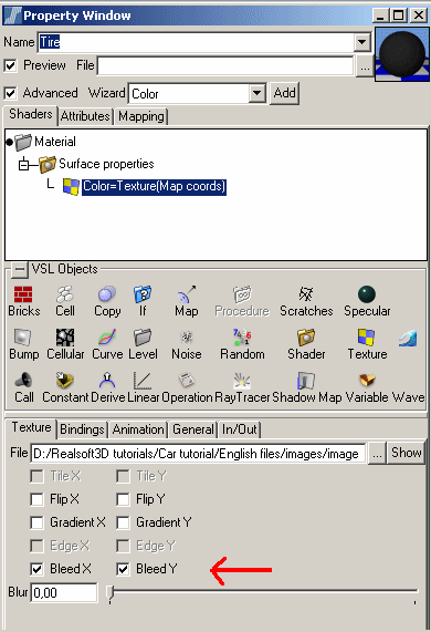 Create a new VSL material and call it Tire. Open the VSL property window, check the Preview and Advanced boxes. Drag and drop a Shader object on the Material icon in the VSL hierarchy. This creates a Surface properties shader. Add a texture object (drag and drop it on the Surface properties shader) and select the image you wish to use for the texture (in our case the Pirelli P3000 image). Then set the Bleed X and Bleed Y checkboxes. The Bleed option extrapolates texture edge colors outside texture mapped area: