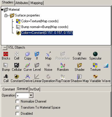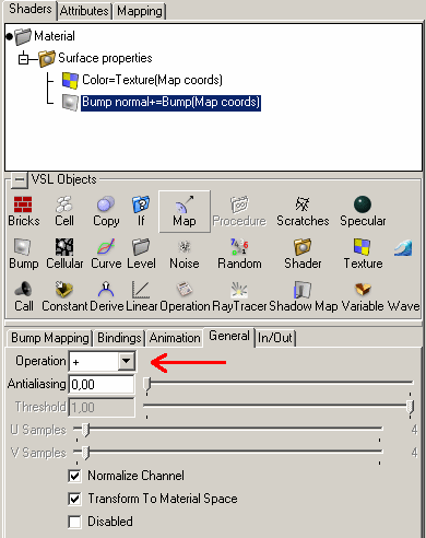 Then drag and drop the Bump icon on the Surface properties shader. Click the General tab and set Operation to ‘+’ and now your VSL shader looks like this: