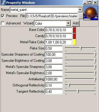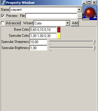 Of course you can change the appearance of these shaders if you like. For instance, select the carpaint shader in the Materials tab of the Select Window and open its Property Window. Make sure you have the Preview option set, so you can see the effect of your changes immediately. By default the shader allows you to change the base color, specular color, specular sharpness and specular brightness. Changing the base color changes the color of the carparts with this shader. The specular color defines the color of the highlights. If you know your way around in VSL, set the Advanced option to access the VSL statements and have even more control over these shaders. Just play around with the settings and see what results you like best!