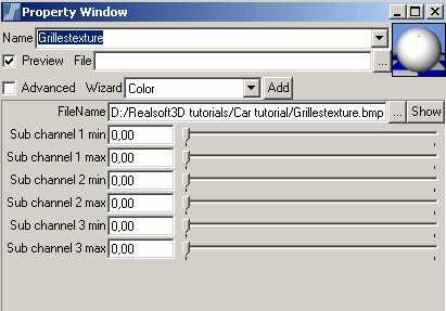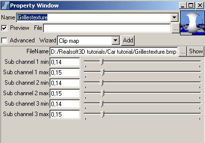 You need to define a color that you wish to cause the clipping effect. If you click the Show button, the selected texture is shown. In this case it is a dark grid like texture, with dark grey holes in it. The holes will be used as ‘cutters’. With the Sub channel controls you need to find the combination of values that cause a clipping effect. The good thing about grey is that the RGB values are the same, so the sub channel values must also be the same for each of the three sub channels. Take a look at the next image to see the correct settings: