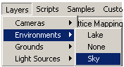 Realistically rendering objects with shiny surfaces, like this car, requires the use of GI (Global Illumination). Setting up the environment for GI is easy. Create a new level under the Root level and rename that to GI Scene. In that level create a new level via the Layers -> Environments -> Sky menu. This adds a new level object to the hierarchy, called Environments. This contains a wireframe invisible mesh in the shape of a dome (or hemisphere). To carefully position the dome, make the mesh visible again by unsetting the WF Inv in the MiscTools toolbar. When done, make it WF Inv again.