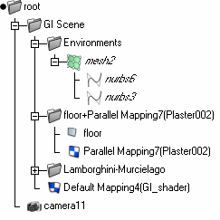 Then drop the Floor, the Environments and the Lamborghini into the GI Scene level. Select the GI Scene level and add a GI shader to it. Finally, under the Root, add a camera object. The hierarchy looks like this now: