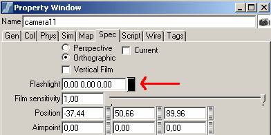 The colors in the sky dome already have been addressed here, so let’s have a look at the camera. Select the camera object in the hierarchy and open its properties at the Spec tab. For the best results, when working with GI, it’s advised to set the Flashlight to black. Click the grey colored icon and select a black icon in the colors window that pops up. You can also manually enter three zeroes (with spaces in between) at the input field; the result is the same: