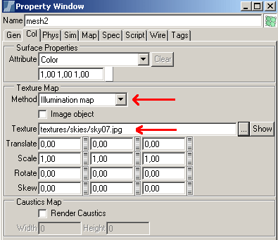Basically the setup is done, now it’s time to do some tweaking and customizing. Let’s start with the Environments level (our sky dome). Select the mesh level inside the Environments level and open its properties at the Col tab. Make sure the texture map method is set to Illumination map and select your favorite sky texture. Illumination maps add diffuse light (no hard shadows) to the scene using the colors of your texture. So if you take a blue sky, the effect is that bluish light is added to the scene; change it to a darker, orange yellowish sky with a sunset, and the effect on your render changes dramatically. It is advisable to set up some simple scenes (just a shiny sphere on a floor) and test (small 200 * 200 renders) the outcome before final rendering.