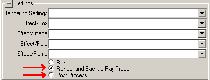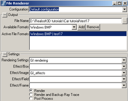 The last part in the setup is the File Rendering Window. As you probably know, this window has a lot of options. Here we only want to make sure that all the settings you have applied in your scene are also taken into account when rendering the image. The important part here is the Settings section. You must have selected GI Rendering in the Rendering Settings field and GI_effects in the Effect/Image field. If you forget this, the image will render with the default rendering configuration and there will be no GI applied.