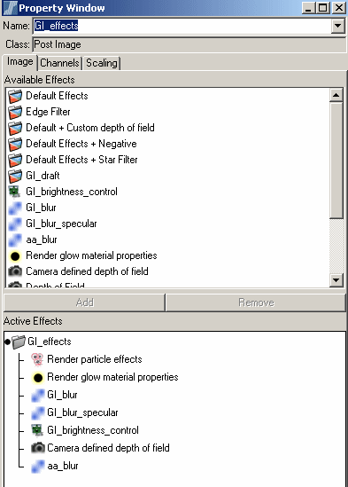 The lower half of the window shows the list of effects that are ‘ inside the container’ and there are some in the list you don’t need. Select the Render particle effects and then click the Remove button. Repeat that for the Render glow material properties. For each of the effects in the container, you can change the properties as well. This is done in the Post Image Effects tab itself. There are two important effects in the container we wish to address here: GI_brightness_control and GI_blur.
