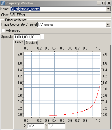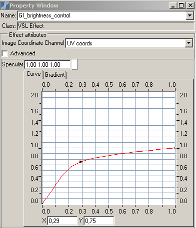As the name already suggests, GI_brightness_control gives you control over the overall image brightness. The brightness is controlled via a curve. You can access the curve by double clicking on the GI_brightness_control icon in the Post Image Effects tab. The curve shows the RGB values of the knot points on the curve. You see only the red curve, because it is exactly on top of the blue and the green one. So it is possible to change, for instance, only the red component in the image to brighter or darker. If you click and move a knot point, the underlying curve appears. To select all curves at the same time, simply drag a box around the knot point and then move it. Which curve shape is best, is again a matter of trying out. Keep the curve’s minimum and maximum values between 0 and 1.