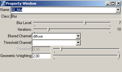 The GI_blur is a time consuming parameter: higher values lead to longer render times. GI_blur blurs out the grain which is caused by low ray counts in the GI_shader. Remember that heavy blurring can cause loss of detail and also leads to longer render times. Try for instance Blur level = 7 and Iterations = 10 to start with. Again, you can decide the parameters here, testing will tell you which settings are best.
