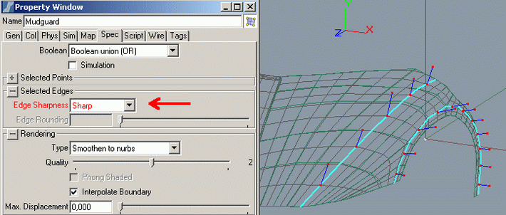 Switch to Edge Edit mode. Select the edges that represent the lines marked red in the image above. Edges sharpness is controlled in the Property window at the Spec tab. Select the Mudguard object in the hierarchy and open the Property window at the Spec tab. In the Selected Edges section, select ‘Sharp’ from the drop-down list. This makes all selected edges sharp.