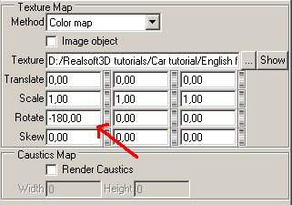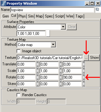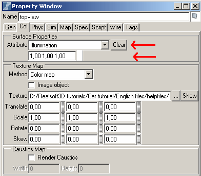 Go to the Col tab and use the Texture field to select the reference image representing the top view of the car. Also, set the Rotate values as shown in the screenshot above. In the Surface properties section select the Illumination attribute from the drop down list. Set Illumination to 1,00 1,00 1,00 (pure white if you use the RGB color scale). See next screenshot: