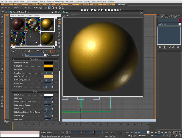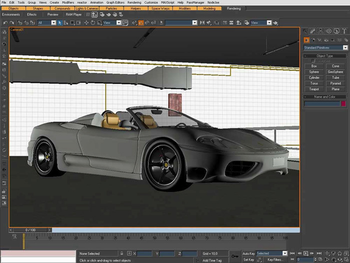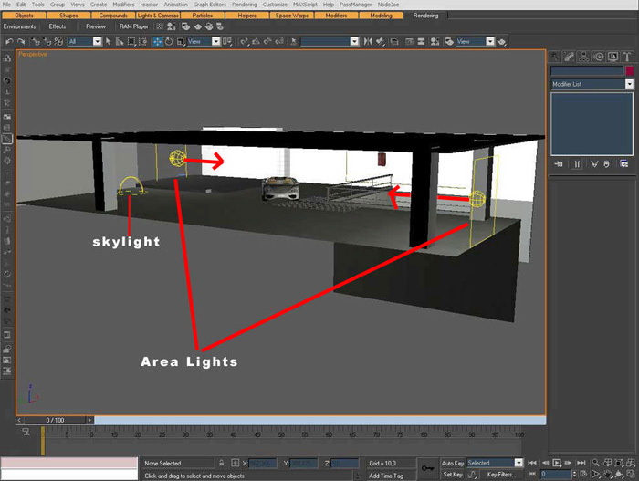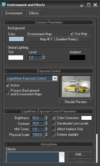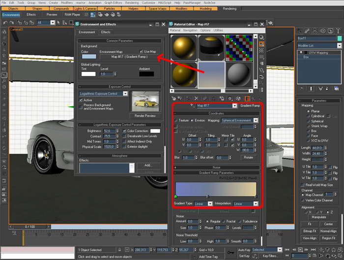 I left the walls open behind the camera, so environment color can pass to the scene and reclected on the car body and the rest..I put a gradient ramp on a slot, selected spherical environment mapping and choosed this for Max’s environment..Its allways better to use a gradient ramp to mimic atmosphere..In this case environment color is not seen well on the scene but it helps a lot for the progress..