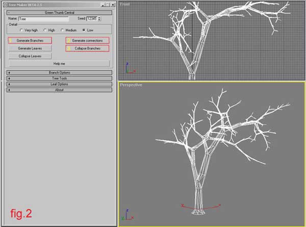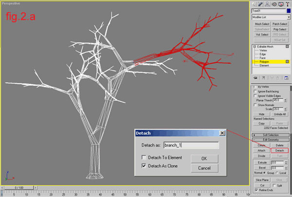 Here I am going to explain the easiest way. In my case I used the free script treemaker by Shawn Lewis http://www.scriptspot.com. I created a tree with the default parameters. From the script’s menu I converted it to editable mesh. On polygon level I selected the branch/es/ and detached it as clone giving it a name for example “branch_1”; (fig. 2, fig. 2a)