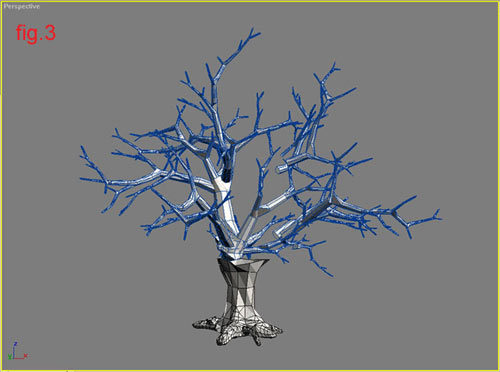 Then you delete the mesh saving only the clone (branch_1), and using rotate and clone operations arrange the crown of the tree (similar to fig. 3).
