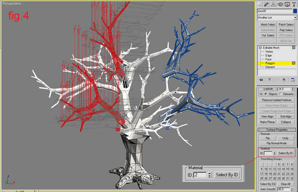 Attach all of the branches in one object. Go to polygon level and make a random or exactly chosen selections – it depends of what you want to achieve. In my case I selected only the ends of different branches. Give material ID number to the selection/s/. If you are going to place more than one fur on the object use different selections with different ID’s.
