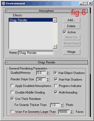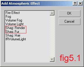 Then close the Edit Mesh menu and go to the Environment panel. Press the Add button and select Shag:Render and Shag:Fur (fig. 5, fig. 5.1)