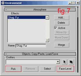Then you go to the Shag:Fur field, click on the Pick button and then in one of the viewports select the crown. After that you will see the whole object covered with fur. Press the Face Level button and tell the fur where to be placed. (fig. 7, fig. 7.1)