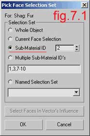 There you choose Sub-Material ID and type 2 in the field. If there is only one selection you can select Current Face Selection, but in more complex objects it is better for you to choose between Named Selection, Sub ID or Multiple Sub IDs. In the viewports now you can see that the fur is in the right place.