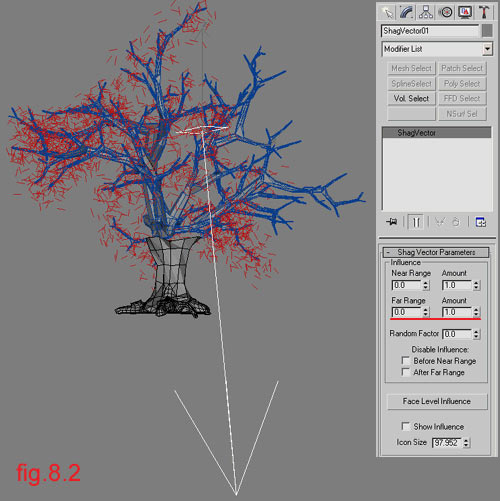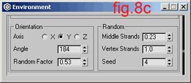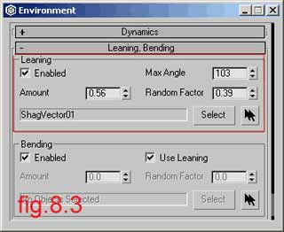 Then you go to the fur menu in the Leaning and Bending fields. In the Leaning section press the Select button and choose the vector. Then play with Amount, Max Angle and Random Factor. (fig 8.3)