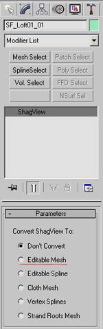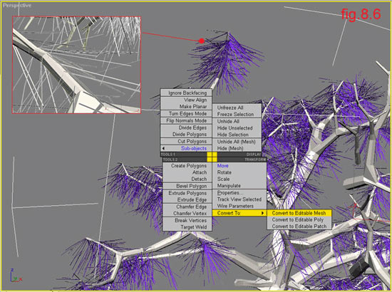 Select the Fur object in the viewport and with right mouse click convert it to an Editable Mesh and give it a name “subbranches”; for example (fig 8.6)