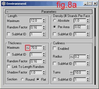 Then you go down in the fur menu where the parameters for Length, Thickness and Density are. For length type 50.00, for thickness type 2.0 and check the box named Flat in the Section field. For density type 0.1 (fig 8.0)