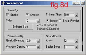 Check Enable geometry, make it 2 sided and type minimum parameters in Strand Detail (fig. 8d)